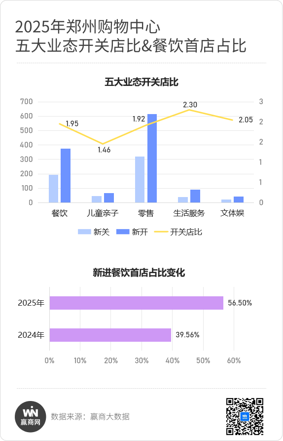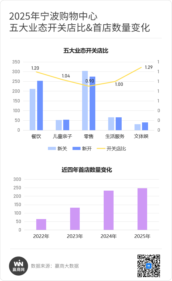 需求端看,据赢商大数据监测,2025年宁波购物中心品牌调整数量1300多家,开关店比1.04。首店经济加速腾飞,全年新进首店数创近四年新高,至247家,拉动供需提质升级。