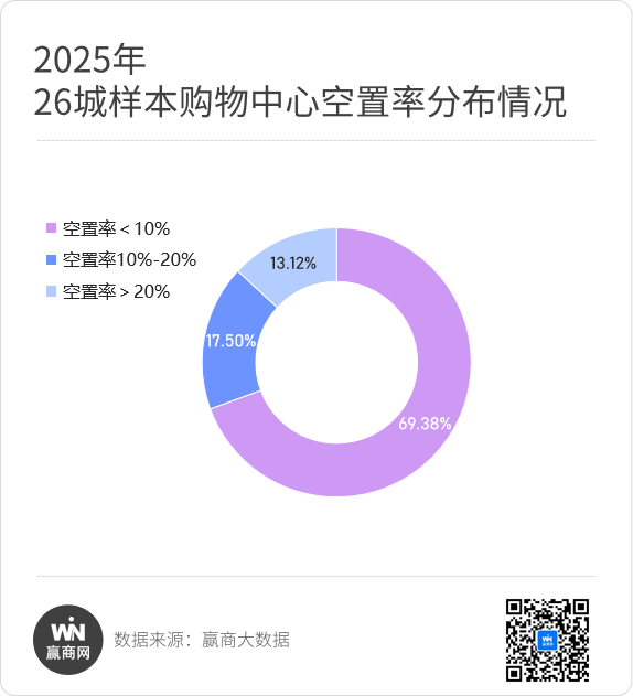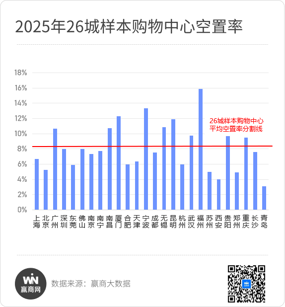 2025年,600+样本购物中心分布的重点26城,10城空置率同比上升、高于26城均值(占比同比2024年下降超两成)。