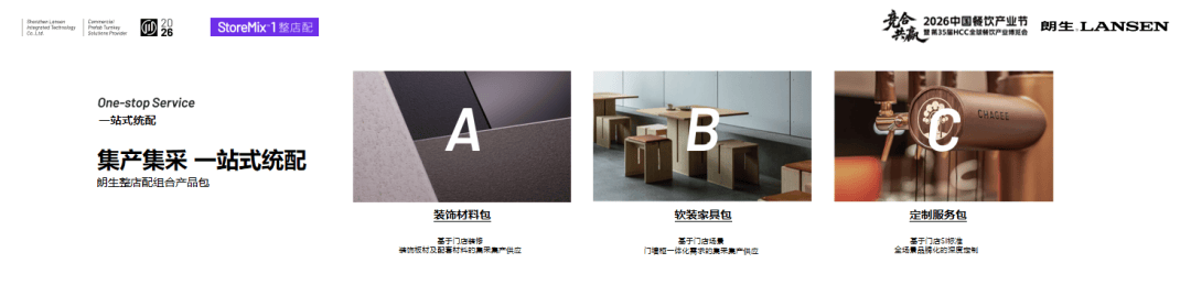 其次是“管理减负”。传统门店营建需要对接多家供应商,集采流程烦琐,沟通、库存、售后等综合成本居高不下。为解决这一痛点,朗生推出了专门的标准服务包。比如装饰料包、软装家具包、专属定制服务包等等,一站式解决门店营建所需材料。此外,朗生还打造了全品类标准化餐饮家具,覆盖收银台、餐边柜、调料台、吊柜、备餐柜等所有餐饮门店的刚需品类,大幅降低品牌营建管理成本,提高营建效率。