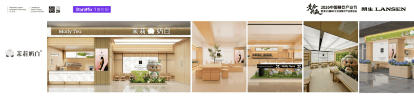第二个案例是茉莉奶白。茉莉奶白品牌主打摩登、时尚风格,核心面向女性消费群体,空间诉求以治愈、温柔为主。为此,我们专门选用温柔粉色系为主色调,搭配浅色木纹材质与柔光氛围设计,精准贴合女性消费群体的情感诉求,强化品牌亲和力。